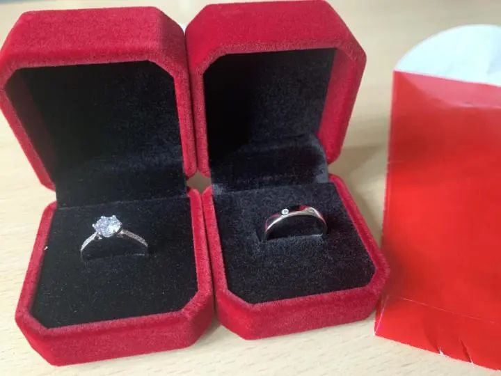 乍一看,这对戒指还跟真的一样,上面的“钻石”在光照之下,还能折射出蓝色的荧光。