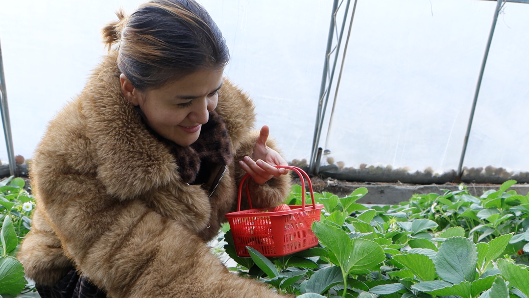 游客阿孜古力·吐尔地说:“刚好现在是草莓成熟季,就来这边采摘点新鲜草莓,也算是一种解压,释放工作和生活中的压力。我刚才采摘的时候也吃了几个,口感很香甜。”