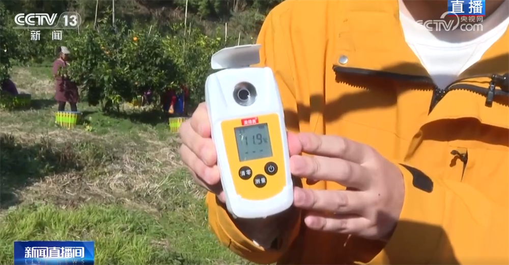 这里的柑橘有什么优势呢?皮薄、汁多、甜度高。您看,皮非常薄,只有2—3毫米,中间的果肉隔膜也是薄如蝉翼,所以整个果实的可食率达到76.8%,汁水也很多。此外,糖度也是衡量品质的关键,我们来检测一下它有多甜。您看,数值显示达到了11.9,这是什么概念呢?我们常吃的西瓜的糖度一般是12度左右,说明它的含糖量还是非常高的。