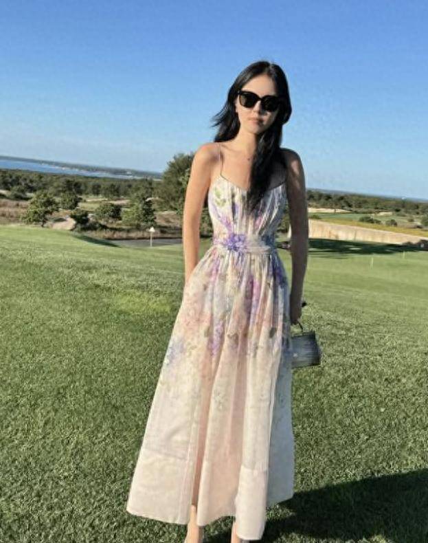 蔚蓝海岸边的白色纱幔随风轻扬,法图麦·李一袭碎花吊带长裙勾勒出纤细的身姿,阳光在她精致的锁骨上跳跃。这位23岁的姑娘站在鲜花拱门下,浪卷发间若隐若现的钻石耳钉与颈间简约的项链相映成趣,墨镜后的笑容比加州的阳光还要明媚。这场私密的海岛婚礼,每一帧都像从时尚杂志撕下的内页。
