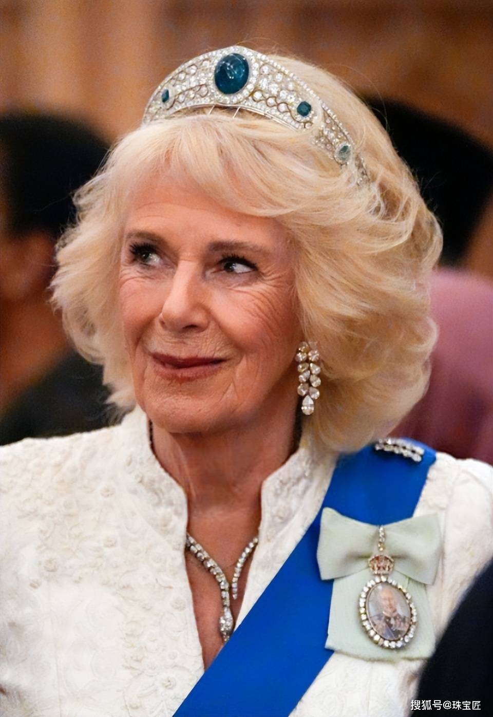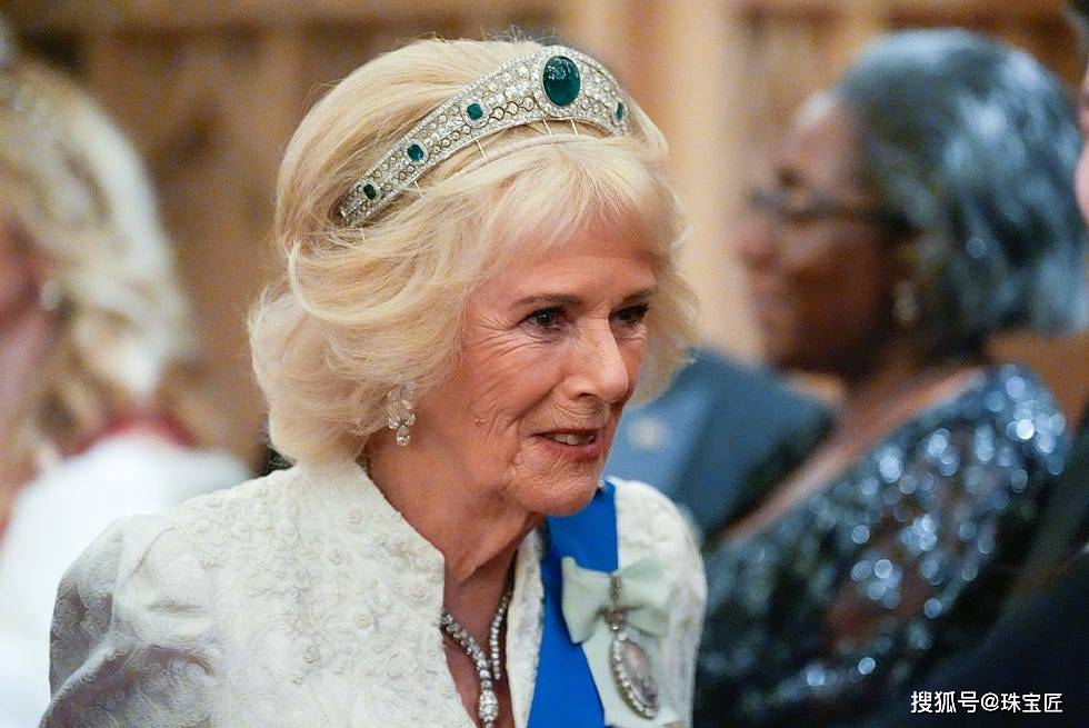 在温莎城堡举行的外交使团招待会上,英国王后卡米拉身穿一席白色刺绣礼服,首次佩戴了这顶格雷维尔祖母绿冠冕,惊艳亮相。