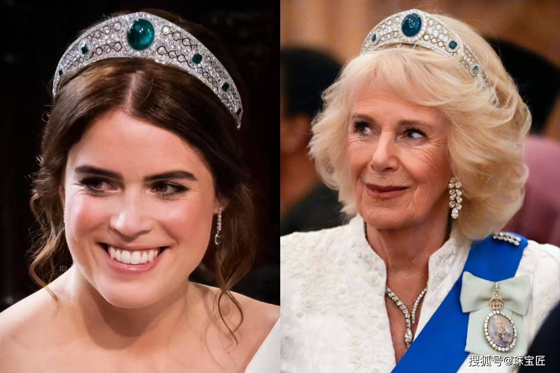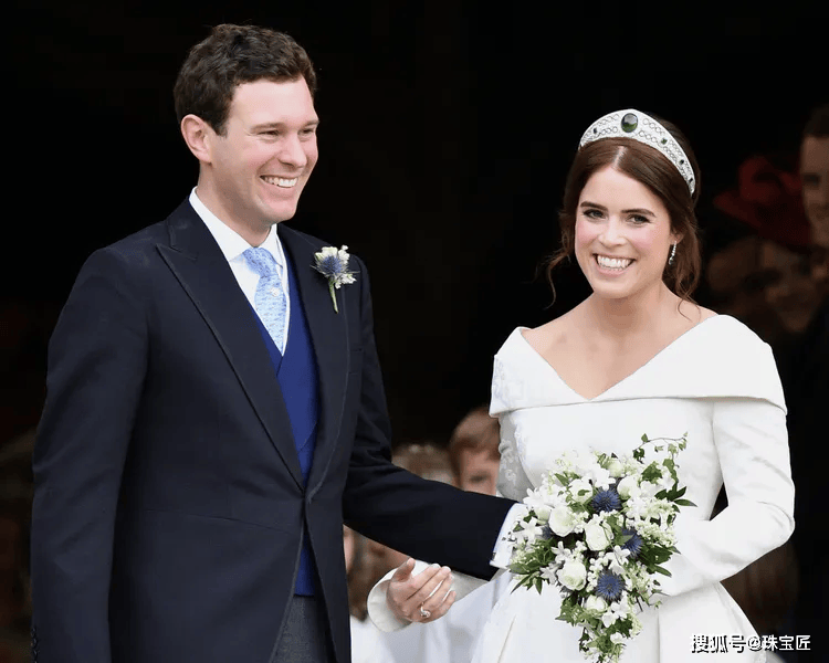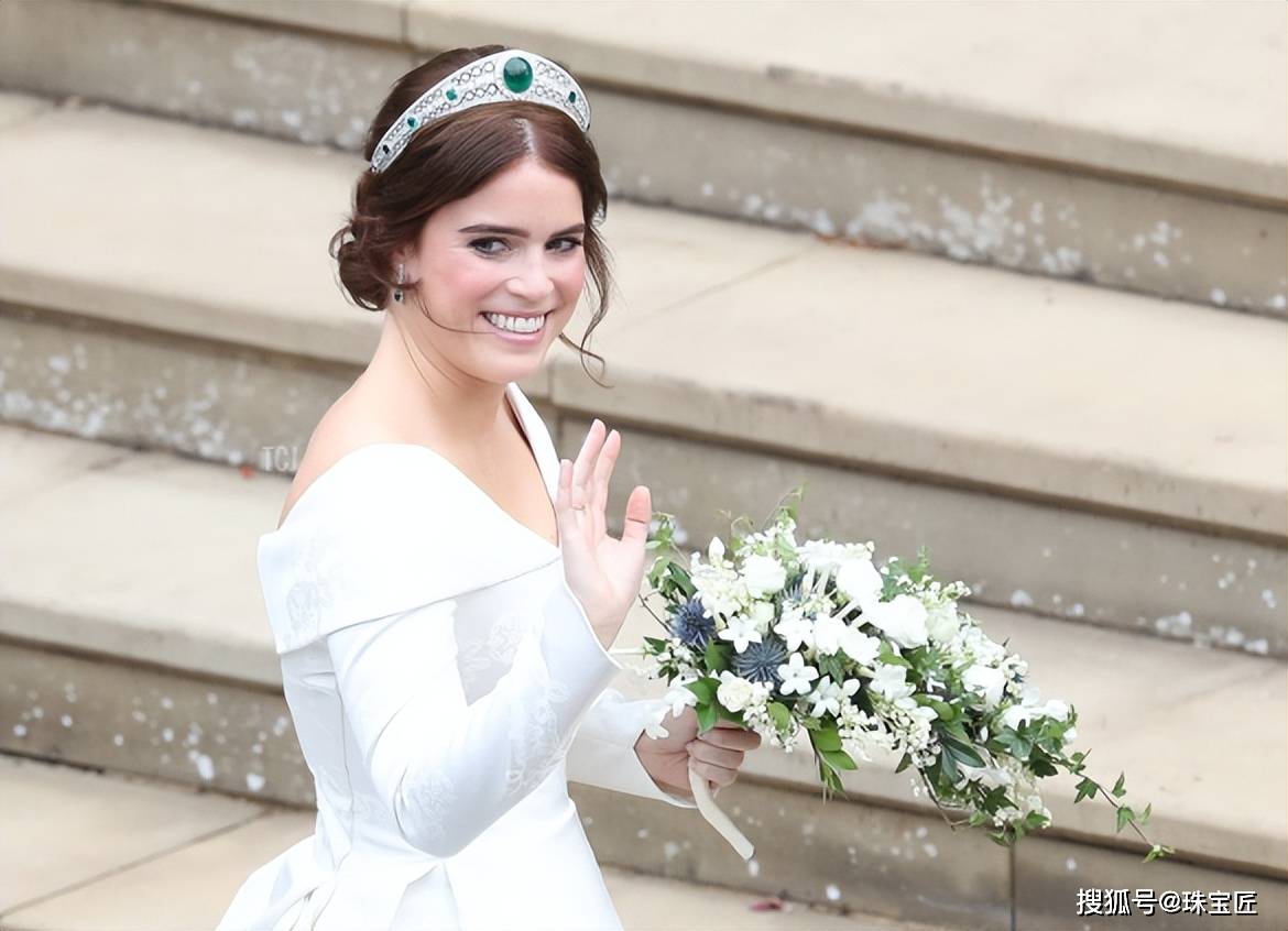 在婚礼上,尤金妮公主一袭白纱,头戴祖母绿冠冕的模样,瞬间成为全球媒体焦点,也被誉为那场婚礼中最具传承意义的画面。