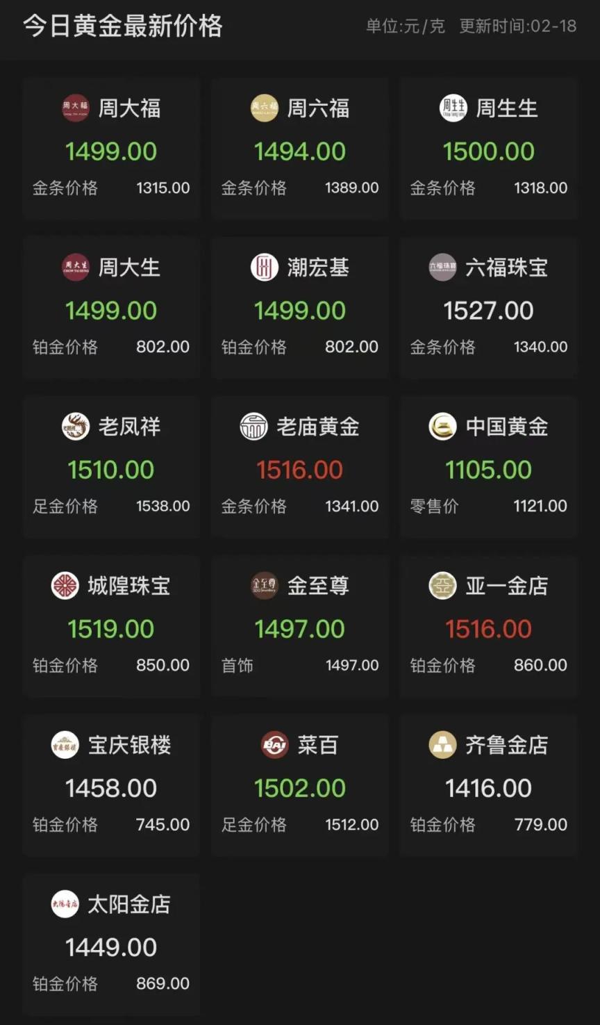 2月18日,国内黄金饰品价格对比显示,多家黄金珠宝品牌当日公布的境内足金首饰价格回落至1500元下方,周大福、周大生、潮宏基报价1499元/克。六福珠宝、老庙黄金、周生生、老凤祥、菜百克价仍维持在1500元水平,分别报价1527元、1516元、1500元、1510元、1502元。